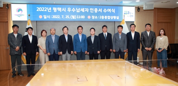 [금요저널] 평택시는 지방세를 성실하게 납부해 시 재정확충에 기여한 납세자들이 사회적으로 존경과 우대를 받을 수 있는 토대를 마련하고자, 에스피엘 주식회사 등 법인 6곳과 개인 8명을 ‘2022년 평택시 우수납세자’로 선정해 인증서를 수여했다.