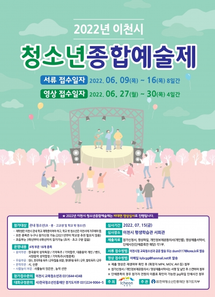 [금요저널] 문화예술계 주역이 될 청소년들의 문화적 감수성과 예술적 재능을 펼치는 문화예술축제인 이천시 주최, 한국청소년진흥재단 주관의 2022년 이천시 청소년 종합예술제가 지난 17일 음악⋅무용⋅사물놀이 부문, 22일에는 문학부문 심사 결과를 발표하면서 코로나19에도 불구, 성황리에 마쳤다.