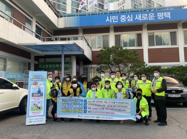 [금요저널] 평택시 세교동 경기행복마을관리소는 지난 27일 청소년 지도위원 회원들과 함께 모두가 행복한 산책길, 성숙하고 올바른 반려동물 문화 조성을 위한 펫티켓 준수 홍보를 진행했다.