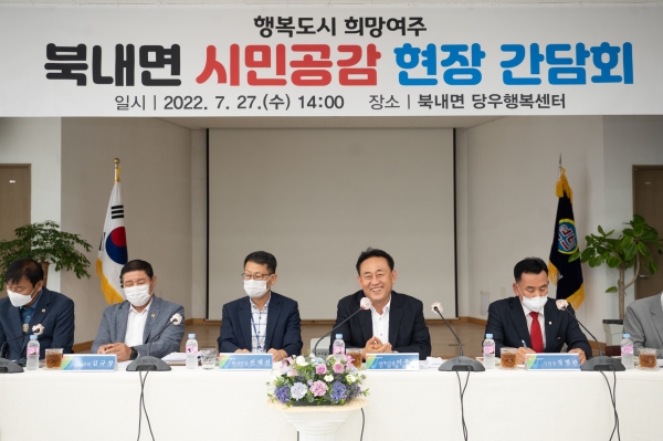 [금요저널] 이충우 여주시장이 민선8기의 새로운 출범을 맞아 12개 읍면동을 순회해 비전을 공유하고 시민의 소리를 듣는 ‘시민공감 현장 간담회’가 7월 27일 북내면 당우행복센터에서 개최됐다.