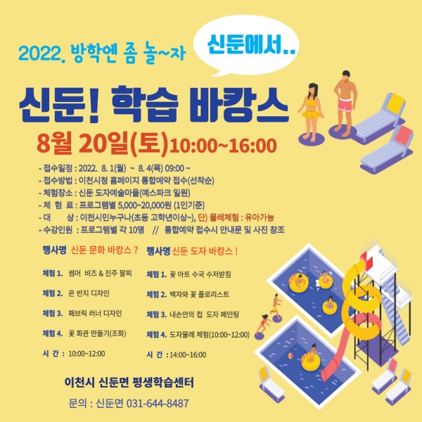 문화바캉스는 비즈팔찌, 은반지, 러너디자인, 꽃화관만들기로 구성했고 도자바캉스는 도자 꽃수저받침, 백자와 플로리스트, 내손안의 컵 페인팅, 물레체험으로 구성해 신둔의 문화적 특성을 기반으로 품격있는 평생학습 콘텐츠로 제공할 계획이라고 전했다.