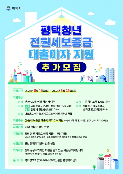 2022년 ‘평택시 청년 전월세보증금 대출이자 지원’ 참여자 추가모집 예정