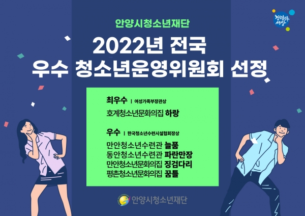 [금요저널] 안양시청소년재단 산하 5개 시설 청소년운영위원회가 2022년 전국 우수 청소년운영위원회로 선정됐다.