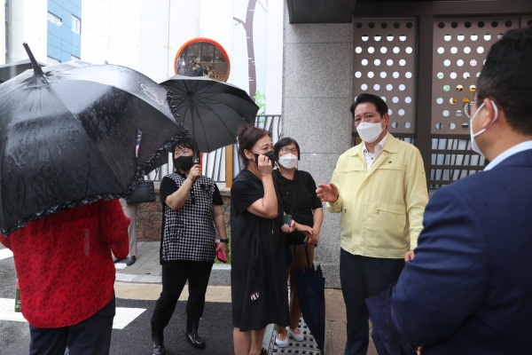 임시 대피소를 방문한 최 시장은 갑작스러운 침수 피해로 상심한 시민을 위로하고 구호 물품을 챙겼다.