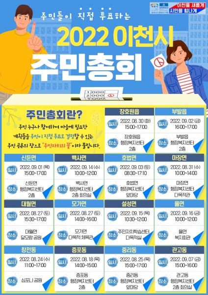 [금요저널] 경기도 이천시는 오는 18일부터 9월 16일까지 14개 읍면동 주민자치회가 주관해 읍면동 주민총회를 개최한다고 밝혔다.