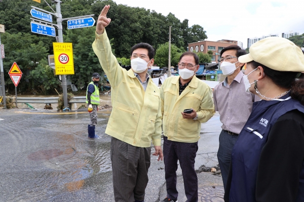 이 시장은 9일에 이어 10일 수지구 동천동 고기교를 방문해 수해 현장을 둘러보며 피해 주민들을 위로하고 신속한 복구와 재발 방지 대책 마련을 지시했다.