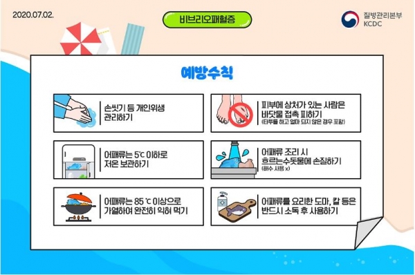 어패류를 취급할 경우 장갑 착용하에 흐르는 수돗물에 씻고 85℃ 이상으로 가열 후 섭취한다.