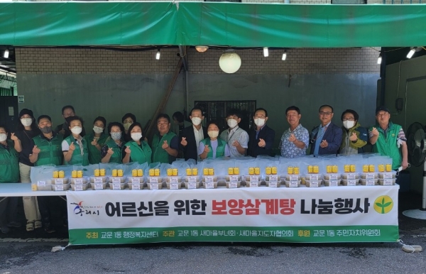 교문1동은 이수원 주민자치위원장이 생닭 130마리를 후원하고 새마을 회원들과 교문1동 동장이 닭을 직접 손질하고 끓여 마련한 보양삼계탕과 겉절이 등을 취약계층에게 포장·전달했다.
