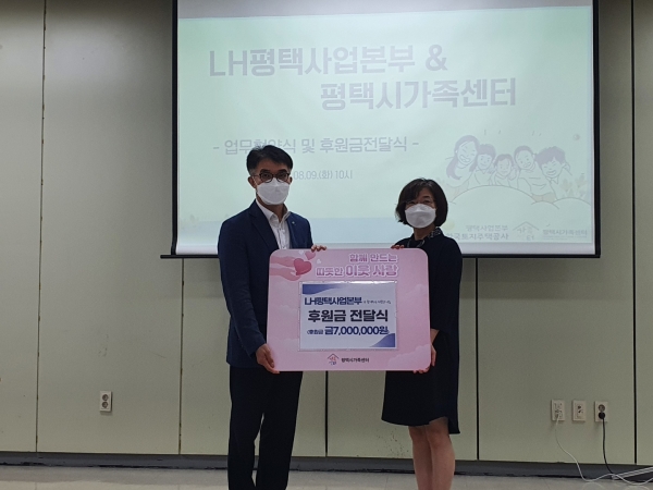 [금요저널] 평택시가족센터는 지난 9일 LH평택사업본부와 업무협약을 체결하고 후원금 전달식을 진행했다.
