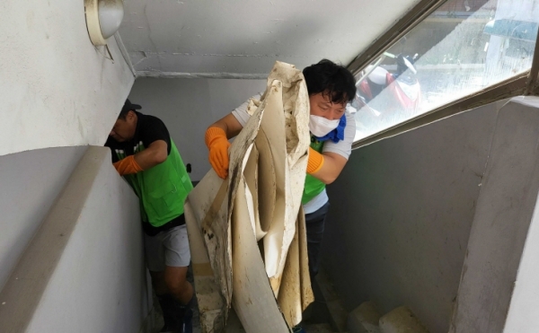 수해복구 현장을 찾은 임직원은 침수된 반지하 주택 내부의 집기류를 걷어내 망가진 가구와 가전제품 등 폐기물을 수거하고 흙탕물로 뒤덮인 건물 안팎을 청소했다.