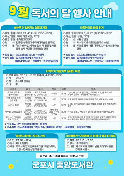 [금요저널] 군포시 중앙도서관에서는 9월 독서의 달을 맞이해 지역작가 재능기부 특강, 인문학 특강, 전시 등 다양한 행사를 진행한다.