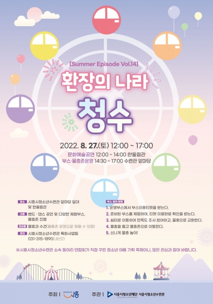 [금요저널] 시흥시청소년수련관은 오는 27일 시흥시가 주최하고 시흥시청소년재단, 시흥시청소년수련관이 주관하는 썸머에피소드 14번째 이야기, ‘환장의 나라 청수’ 축제를 시흥시청소년수련관 앞마당에서 개최한다고 밝혔다.