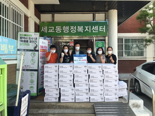[금요저널] 평택시 세교동 지역사회보장협의체는 지난 18일 평택시 청북읍 어소리 소재 더조은 대표 김희철로부터 마스크 2만장을 후원받았다고 밝혔다.