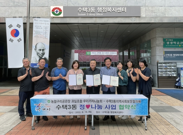 [금요저널] 구리시 수택3동 지역사회보장협의체와 ‘농협구리공판장 과일조합 우리끼리나눔회’는 18일 수택3동 행정복지센터에서 ‘정♡나눔’ 사업 추진을 위한 업무 협약식을 체결했다.