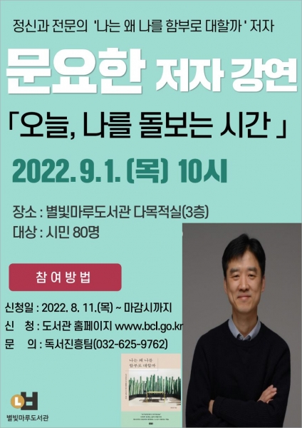 [금요저널] 부천시 별빛마루도서관은 독서의 달을 맞이해 ‘자기 치유, 자기 돌봄’이라는 주제로 9월 1일 오전 10시에 문요한 저자 특강을 개최한다.