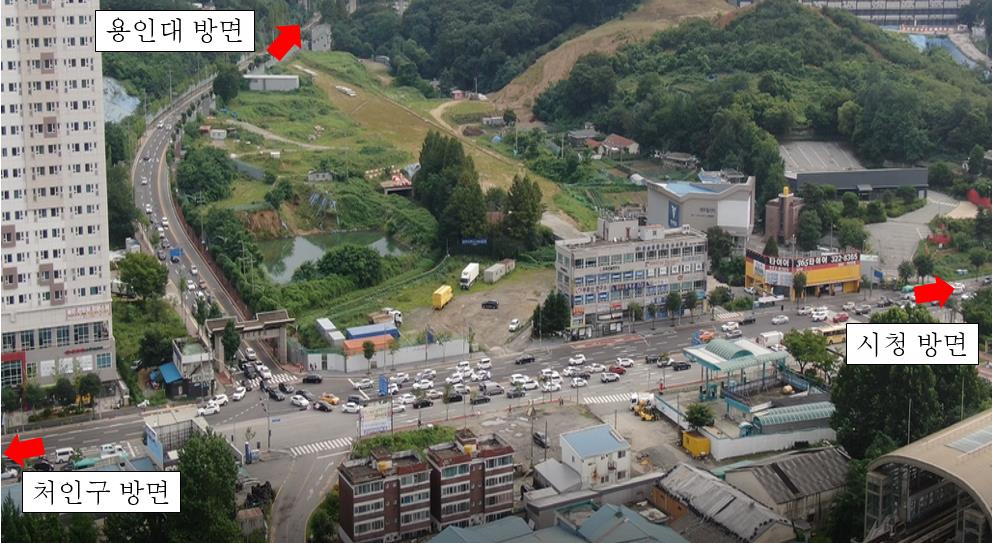시는 용인시청 삼거리의 교통 정체를 해소하기 위해 중부대로 처인구청 방면 5번째 차로에 노면색깔 유도선을 긋고, 버스 정류시에도 후속 차량의 흐름을 방해하지 않도록 차로 넓이를 확대했다.