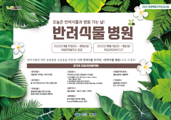 [금요저널] 시흥시가 문화특화지역조성사업의 일환으로 2022 공동체 협력사업 ‘반려식물 병원’을 오는 9월과 10월 각각 시흥문화발전소 창공, 목감아트하우스27에서 운영한다고 22일 밝혔다.