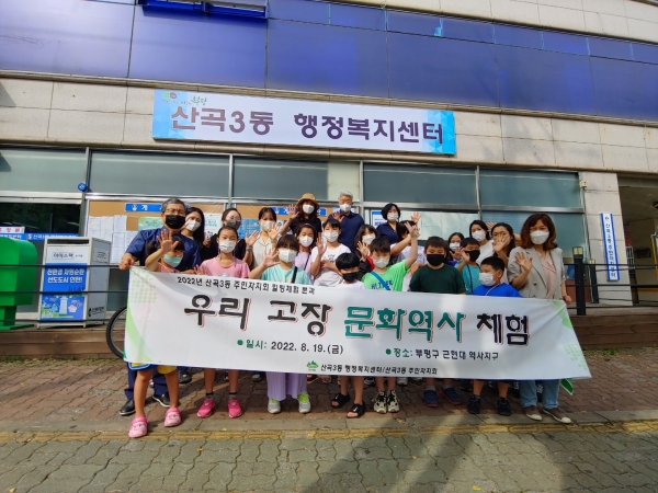 이번 ‘우리 고장 역사문화 체험’ 사업은 주민총회를 통해 결정된 2022년도 산곡3동 마을 사업으로 지역 내 초등학생들이 애향심을 가질 수 있도록 부평의 역사 지구를 직접 돌아보며 전문 해설사의 설명을 듣는 체험 프로그램이다.