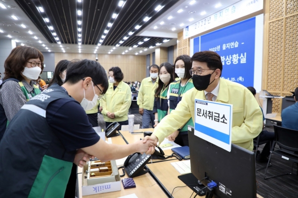[금요저널] 수원특례시의회 김기정 의장과 이재식 부의장을 비롯한 의장단이 22일 수원시청 을지연습장을 방문해 2022 을지연습 훈련 상황을 참관하고 직원들의 노고를 격려했다.
