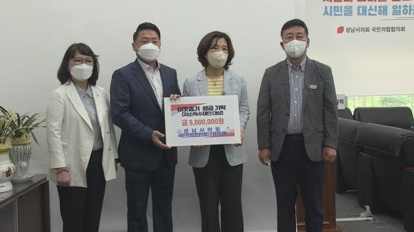 [금요저널] 성남시의회 국민의힘협의회는 22일 오전 11시 저소득수재민 대상 이웃돕기 성금 500만원을 성남시 복지국에 전달했다.