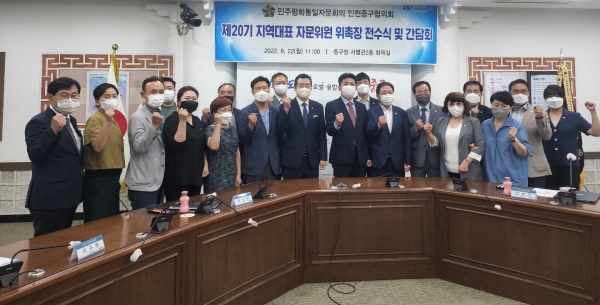 [금요저널] 민주평화통일자문회의 인천중구협의회(회장 윤경원)는 8.22(월) 11시, 중구청 서별관2층회의실에서 중구청장, 지역대표자문위원, 간부자문위원, 관계공무원 등 35여명이 참석한 가운데 ‘20기 지역대표자문위원 위촉장 전수식 및 간담회’을 개최했다.
