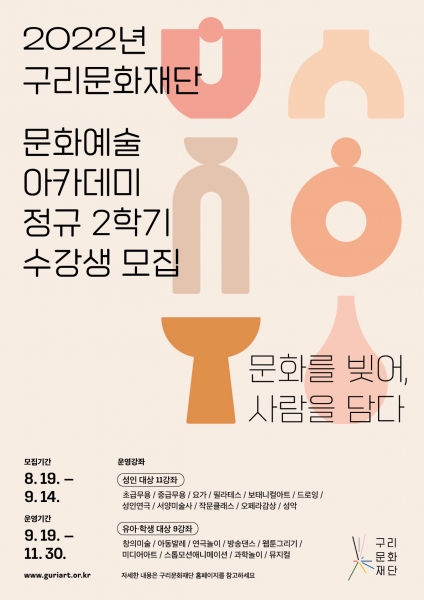 ‘문화를 빚어, 사람을 담다’라는 슬로건으로 운영되는 이번 아카데미는 오는 9월 19일부터 11월 30일까지 성인 대상 11강좌, 유아·학생 대상 9강좌 등 총 20강좌가 구리아트홀에서 운영될 예정이다.