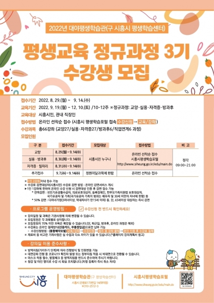 [금요저널] 시흥시가 오는 29일부터 9월 14일까지 2022년 3기 평생학습 프로그램 수강생을 모집한다.