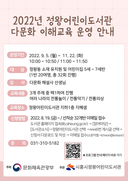 정왕어린이도서관 관계자는 “이번 교육을 통해 ‘도서관’이라는 공간에 처음 와보는 유아들도 있을 텐데, 즐거운 다문화 이해 교육과 더불어 어린이를 위해 준비된 다양한 그림책과 원화전시를 풍성하게 즐기길 바란다 또 다양한 사람들이 도서관을 찾는 모습을 어린이들이 직접 보는 것도 교육의 연장선이 될 것으로 기대된다”고 전했다.