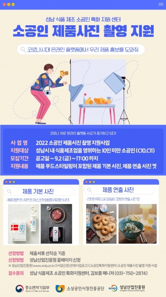 [금요저널] 성남산업진흥원이 오는 9월 2일까지 식품제조 소공인들의 온라인 유통판로 매출 증대를 도모하기 위해 소공인 제품사진 촬영 지원사업에 참여할 기업을 모집한다.