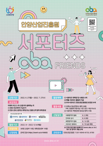 ‘aba프렌즈’라는 명칭은 진흥원의 영문명‘Anyang Business Agency’의 약자 ‘aba’와 진흥원과 시민이 함께한다는 의미를 담은‘프렌즈’가 합쳐진 것이며 시민과 함께해 진흥원을 알리고 소통하는 기회를 마련하고자 창단됐다.