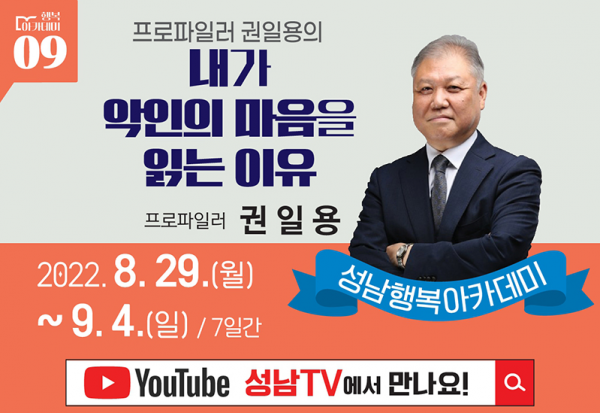 이 기간 ‘내가 악인의 마음을 읽는 이유’를 주제로 한 권 교수의 강연을 시 공식 유튜브 ‘성남TV’로 시청할 수 있다.