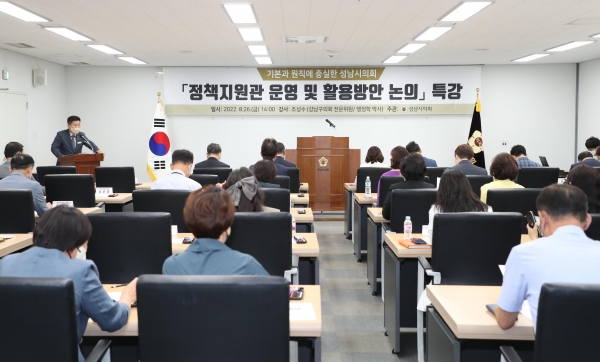 [금요저널] 성남시의회는 26일 시의원과 정책지원관 등 관계 공무원이 참여한 가운데 강남구의회 전문위원이자 행정학 박사인 조성수 강사를 초빙해 ‘정책지원관 운영 및 활용방안 논의’라는 주제로 특강을 열었다.
