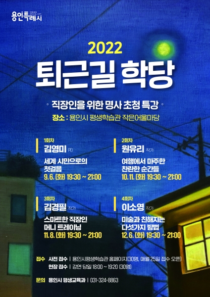 시 관계자는 “낮 시간대 강연 참여가 어려운 직장인 및 용인시민들이 퇴근길 학당을 통해 지친 생활 속 ‘저녁 문화가 있는 삶’을 누리는 계기가 되길 바란다”고 말했다.