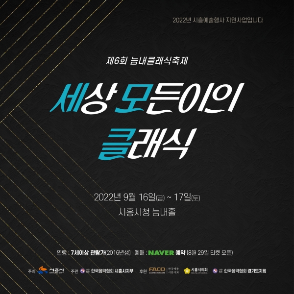 [금요저널] 시흥시가 주최하고 시흥음악협회가 주관하는 제6회 늠내클래식 축제가 오는 9월 16일부터 17일까지 이틀간 시흥시청 늠내홀에서 개최된다.
