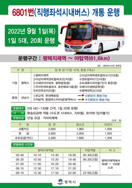 6801번 버스는 평택지제역에서 출발, 소사벌지구 등을 경유해 안성IC로 빠져나가 경부고속도로를 거쳐 성남 판교역, 야탑역간을 운행하는 노선이다.