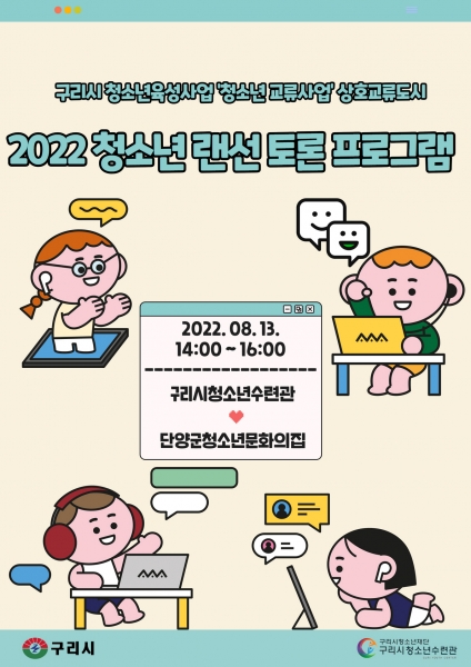‘2022 상호교류도시 청소년 랜선토론회’는 구리시와 자매결연도시인 단양군 청소년들과의 교류를 통해 우호 증진과 함께 청소년들의 주도적 참여로 민주 시민으로의 성장과 자존감 향상을 위한 리더십 교육활동을 진행하는 프로그램이다.