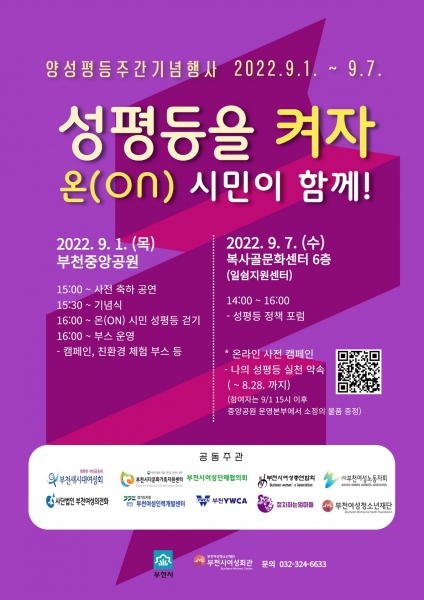 이번 양성평등주간 기념행사는 부천새시대여성회, 부천시다문화가족지원센터, 부천시여성단체협의회, 부천시여성총연합회, 부천여성노동자회, 부천여성의전화, 부천YWCA, 정치하는엄마들, 부천여성청소년재단 등 10개 단체와 유관기관 공동주관으로 기획 단계부터 함께 모여 준비해왔다.