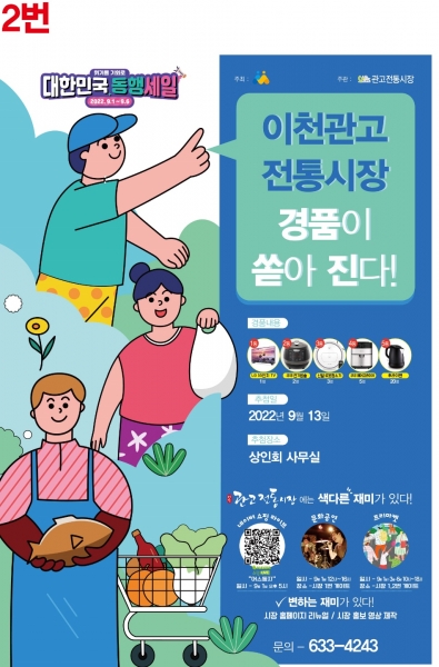 행사기간 내 관고전통시장 이용 고객에 경품 이벤트를 진행하며 오는 9월 13일 추첨을 통해 1등 55인치TV, 2등 전기밥솥, 3등 로봇청소기, 4등 에어프라이어 5등 후라이팬을 증정한다.