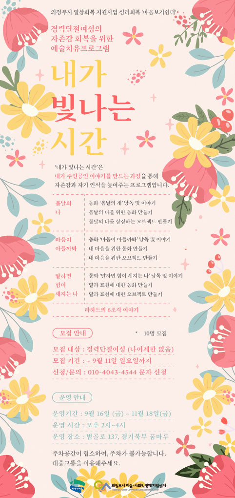 [금요저널] 의정부시 마을·사회적경제 지원센터는 9월 11일까지 일상회복 지원사업의 일환으로 코로나19 장기화로 지쳐있는 경력단절 여성의 심리 치유를 위한 마음 보기 쉼터 사업인 ‘내가 빛나는 시간’의 참여자를 모집한다.