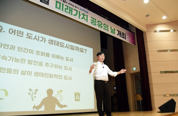 이번 공유의 날에서 다룬 미래가치는 생태도시로써, 먼저 김동근 시장이 ‘자연과 사람이 조화를 이루는 생태도시 의정부’라는 주제로 환경문제의 심각성과 근본적인 원인에 대해 설명하고 생태도시로 나아가기 위한 5가지 기본방향과 시에서 추진 가능한 사업을 구체적으로 제시했다.