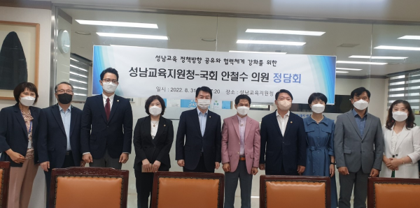 [금요저널] 안철수 국회의원과 경기도의회 성남지역 방성환 의원, 이기인 의원, 이서영 의원은 성남교육지원청을 방문해 각 학교의 현안을 청취하고 교육발전을 위한 의견을 나누는 시간을 가졌다.