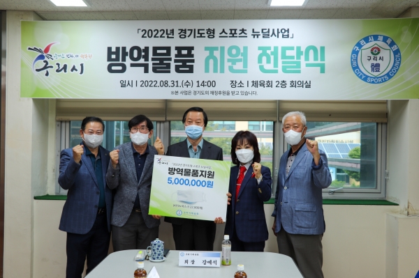 [금요저널] 구리시체육회는 지난 8월 31일 체육회 2층 회의실에서 5개 종목단체 대표자들과 함께 ‘방역물품 지원 전달식’ 을 가졌다.