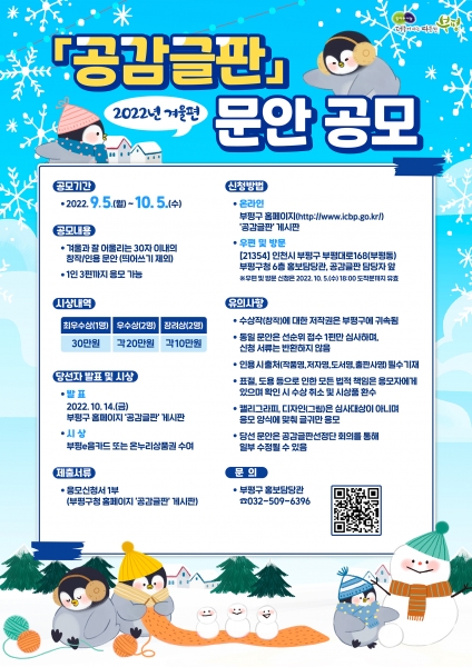 [금요저널] 부평구가 오는 5일부터 다음달 5일까지 한 달간 ‘2022년 겨울편 공감글판’ 문안을 공모한다.