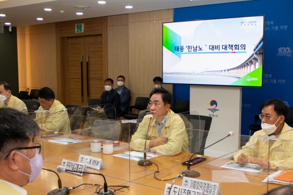 [금요저널] 평택시는 5일 제11호 태풍 ‘힌남노’ 북상에 따른 예상진로 영향범위, 과거 피해내역 등을 공유하고 대처방향과 피해 최소화를 위해 시장 주재 상황판단 및 대책회의를 개최했다.