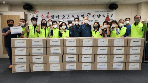 [금요저널] 동두천시 소요동행정복지센터는 지난 5일 소요동 지역사회보장협의체에서 추석 명절을 맞아 관내 취약계층 150가구에 소요드림박스 등 이웃돕기 후원물품을 전달하며 따뜻한 정을 나눴다고 밝혔다.