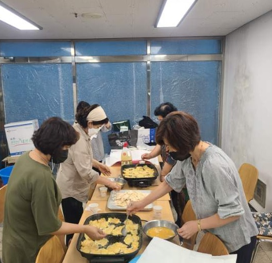 이날은 태풍의 영향으로 많은 비가 내림에도 불구하고 이른 아침부터 지역사회보장협의체 위원 전원이 참석해 시장보기, 재료손질하기, 전부치기, 나물무치기 등 신장1동 행정복지센터 지하 조리실은 명절 분위기로 분주했다.