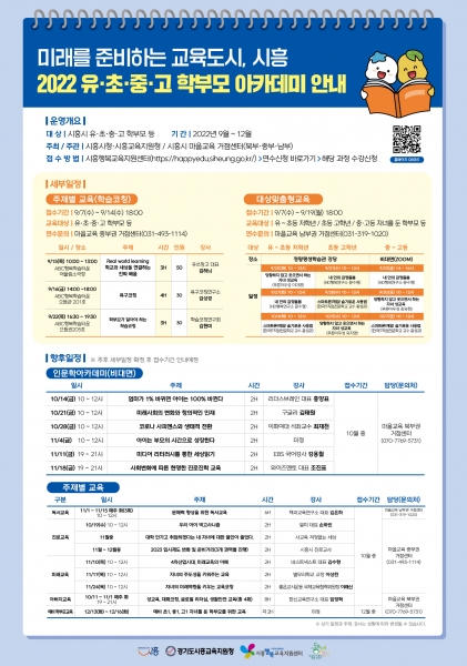 [금요저널] 시흥시와 시흥교육지원청이 공동으로 주최하는 ‘2022 유·초·중·고 학부모 아카데미’가 오는 14일부터 12월까지 진행된다.