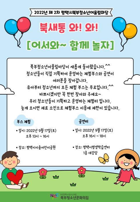 [금요저널] 평택시 위탁기관인 평택시북부청소년문화의집은 청소년이 주체가 되는 문화 활동 성장과 문화 예술 활동을 통한 청소년 중심의 건전한 청소년 문화교류의 장 형성을 위한 2차 북부청소년어울림마당을 오는 17일 토요일 오후 1시부터 6시까지 이충어린이공원과 평택시평생학습센터 1층 대강당에서 개최한다.