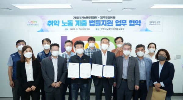 [금요저널] 안양시는 지난 7일 안양시노동인권센터가 법무법인 시민과‘취약 노동 계층 법률지원 업무 협약’을 체결했다고 8일 밝혔다.