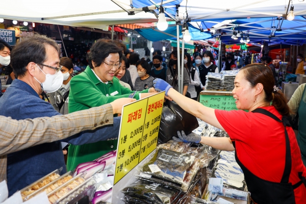 특히 코로나 여파로 힘들어하는 전통시장과 상점가 상인들의 현장을 살피고 애로사항과 불편한 사항 등을 꼼꼼히 챙기며 진심으로 위로와 격려를 전했으며 명절 준비를 위해 시장을 찾은 소비자들과 덕담을 나누며 지역화폐 이용과 전통시장을 자주 찾아줄 것을 당부했다.